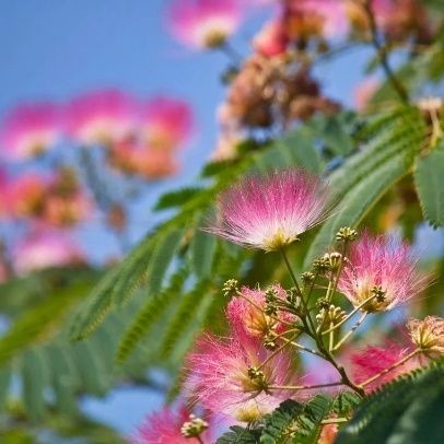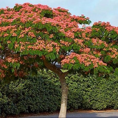 Albizia julibrissin ´Ombrella´® - Albízia ružová ´Ombrella´® alebo aj Hodvábny strom zaujme nielen svojím exotickým vzhľadom, ale aj prekvapivými vlastnosťami. Pôvodne pochádza zo Strednej Ázie. Je ideálny pre každého, kto chce do svojho domova vniesť stredomorský nádych. Najlepšie miesto pre ňu je slnečné a chránené stanovisko. Strom znáša aj sucho a mimoriadne dobre znáša slnko. Vysadený v záhrade potrebuje v mladosti zimnú ochranu. S pribúdajúcim vekom sa stáva čoraz odolnejším voči mrazu. Dokonale sa hodí do stredomorského alebo ázijského prostredia. Je dôležité mať dobre priepustnú pôdu. Malý strom s vejárovitými konármi dosahuje rokmi výšku až 8-10m. Rastie pomaly, za rok pribúda cca 30-50cm. Jej mimoriadny vzhľad vytvára úžasnú atmosféru. Čo je na Albizia julibrissin 'Ombrella' úplne fascinujúce, sú listy, ktoré nielenže pôsobia jemne. Svoju ohromujúcu vlastnosť demonštrujú zvieraním sa cez noc. To dáva hodvábnemu stromu prezývku ´spiaci strom´. Pôsobivý obraz sa vynorí ráno, keď sa listy rozvinú a privítajú nový deň. Jemné listy sú tmavozelené. Dosahujú dĺžku až 30 centimetrov, čím zvýrazňujú stredomorský štýl a pripomínajú palmové listy. Veľké listy majú kosáčikovité lístky, striedavo usporiadané a majú jemne zúbkovitý okraj. Strom v zime stráca listy a jeho plná a malebná korunová štruktúra mu ukazuje ďalšiu nezvyčajnú a atraktívnu stránku. Na rozdiel od ostatných Albizia, Albizia julibrissin 'Ombrella' vytvára prvé kvetné puky už v mladom veku. To znamená, že záhradník si môže už čoskoro vychutnať prvý pohľad na nádherné kvety. Kvety majú mimoriadny vzhľad, sú početné s hodvábnymi vláknami. Jemne voňajúce kvety majú ružovú farbu a žltkastý stred. Albizia julibrissin 'Ombrella' kvitne v lete od júla do augusta. Kvety s veľkosťou 3-5 cm sú výrazné a poskytujú obdivuhodný pohľad.