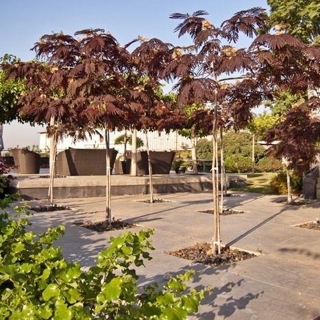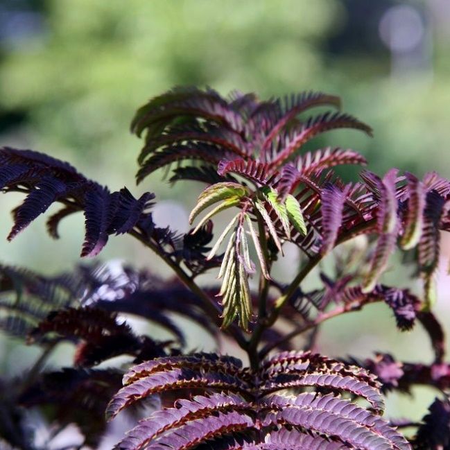 Albizia julibrissin 'Summer Chocolate'® - Albízia ružová 'Summer Chocolate'® sa vyznačuje nápadným tmavým listom. Je to veľký ker alebo malý opadavý strom pôvabného dáždnikovitého tvaru. Strom zdobia veľké papraďovité sýtofialové listy. Vejarovité bronzovo-zelené listy v priebehu sezóny menia farbu na tmavú fialkasto bordovú a zachovávajú si túto farbu až do jesene, dokonca aj v horúcich a vlhkých podmienkach. Nadýchané ružové, ihličkovité kvety zdobené výraznými tyčinkami, sa otvárajú začiatkom leta a pokrývajú celý strom. Voňavé kvety sú príťažlivé pre včely a motýle. Po odkvitnutí sa tvoria fazuľové struky, ktoré pretrvávajú do zimy. Albízia je farebný a exoticky vyzerajúci strom, ktorý nie je náročný a pre svoje rozmery sa hodí aj do menších záhrad.