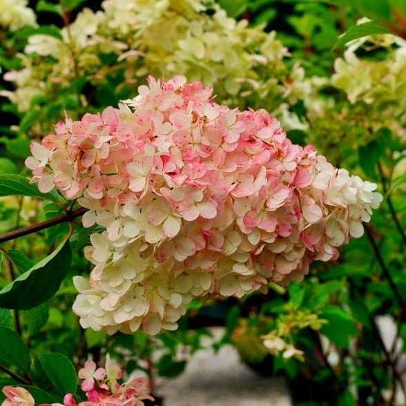Hydrangea paniculata ´Phantom´ - Hortenzia metlinatá ´Phantom´ je jedna z najpôsobivejších a najobľúbenejších odrôd hortenzie metlinatej, cenená predovšetkým pre svoje obrovské a mimoriadne husté súkvetia. Vďaka svojej robustnosti a elegantnej zmene farieb je dominantou každej záhrady od leta až do jesene. Gigantické, kužeľovité súkvetia, ktoré sú veľmi husté a plné. Na začiatku kvitnutia sú čistobiele až krémovo biele, postupne prechádzajú do ružových odtieňov a na jeseň nadobúdajú ružovú až červenkastú farbu. Súkvetia sú tak mohutné, že vytvárajú pôsobivý vizuálny efekt. Obdobie kvitnutia trvá od júla do októbra, pričom najkrajšie sfarbenie sa objavuje koncom leta a na jeseň. Silný a vzpriamený ker s pevnými vetvami, ktoré dokážu udržať aj extrémne veľké súkvetia bez poliehania. Rastie mohutne a kompaktne. Dorastá do výšky až 2 - 3 metre a šírky 1,5 - 2,5 metra. Vytvára impozantný solitér. Pre najbohatšie kvitnutie a najlepšie sfarbenie je ideálne plné slnko (aspoň 6 hodín denne). Preferuje vlhkú, dobre priepustnú, výživnú pôdu s kyslým až mierne kyslým pH. Vyžaduje každoročný jarný rez (február/marec). Silný rez (skrátenie výhonkov na 2-3 púčiky) podporuje tvorbu najväčších súkvetí a udržiava silnú štruktúru kríka.
